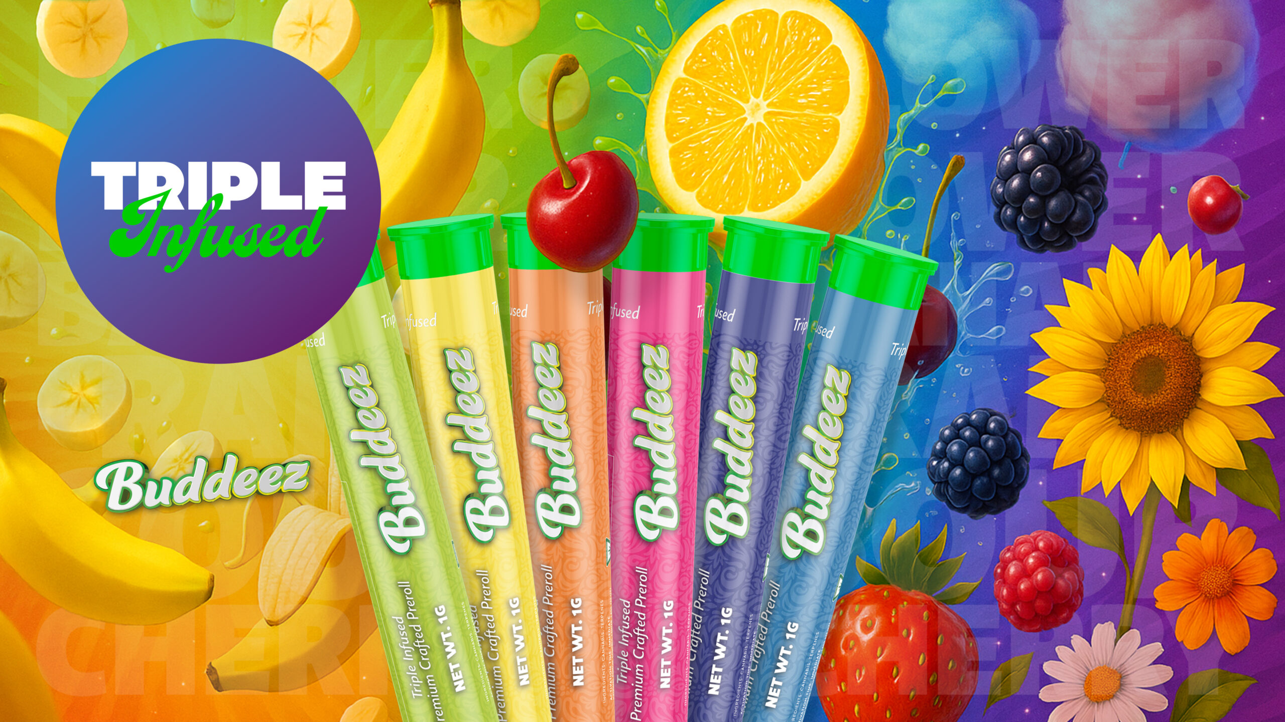 Buddeez-Cotton-Candy Buddeez - Flower Power Buddeez - Banana-Rama Buddeez - Sour Cherry Buddeez - multiflavor Image (fruits and Flowers)